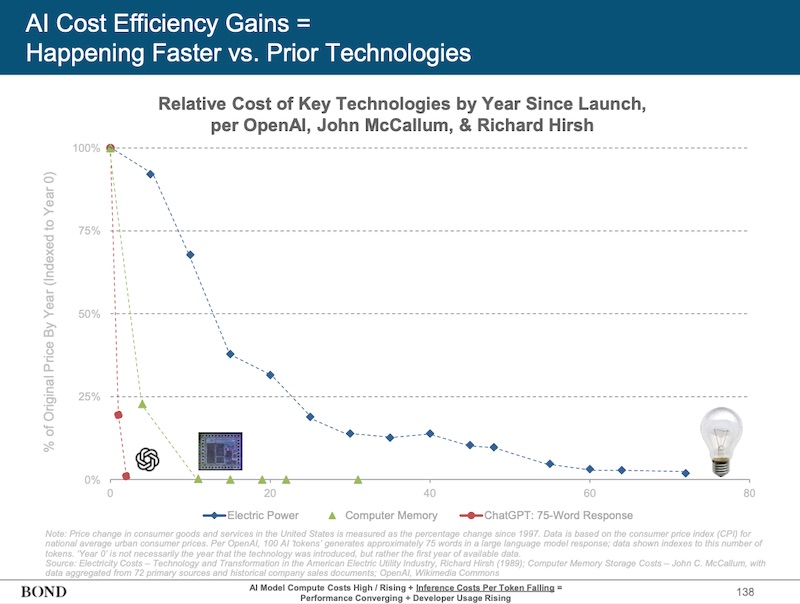 并且,AI技术成本的下降速度,远远超过了历史上的电力与芯片。