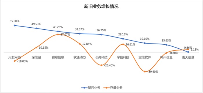 我们根据各公司的业务发展策略将业务分为新兴和存量两类,具体形态基于业务的特点有差异,比如用友网络的新兴业务是云服务,存量业务是软件业务;深信服的新兴业务是云计算及IT基础设施业务,存量业务是网络安全业务;赛意信息的新兴业务是智能制造,存量业务是泛ERP业务;宝信软件的新兴业务是开发类,存量业务是集成类,等等。