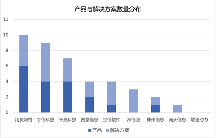 行业形态强于产品形态。按公司的产品与解决方案大类分布数量来看,用友网络、宇信科技公布的数量较多,分别为各自行业提供了业务类、渠道类、管理类的软件;深信服公布的业务为基于云的综合解决方案;神州信息和南天信息偏重集成解决方案;软通动力没有清晰的产品和解决方案说明,从业务上看更多是基于客户所在领域提供人力服务,因此未作明确的产品与解决方案统计。