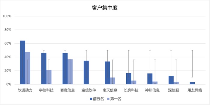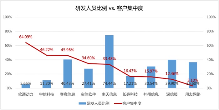 从下图可以证明以上观点。比如南天信息和赛意信息研发人员占比很高,但客户集中度也很高,尚无通过研发拓展收入的必要性,而是需要先证明其产品与解决方案可横向复制,再投入研发;同理宇信科技的研发投入转化率也难以在客户集中度上证明其投入有效性,相对而言长亮科技表现更好。