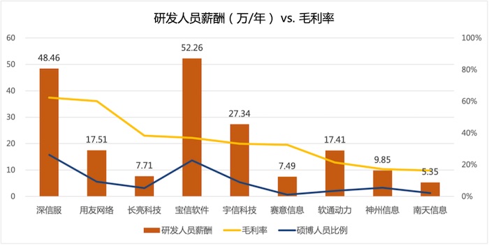 结合研发人员的薪酬水平来看,与毛利率也没有直接的相关性。宝信软件的薪酬水平是最高的,但毛利率仅在第四位,用友网络薪酬水平在第四位,但毛利率居第二,毛利率居第三的长亮科技薪酬水平排在倒数第三。