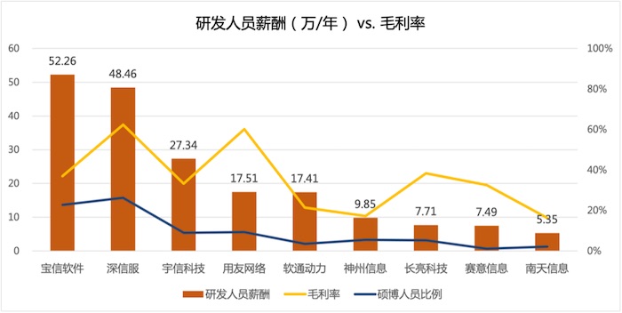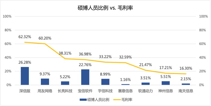 毛利率与高端人才结构不相关。下图可以看到,深信服和宝信软件硕博人员比例最好,但毛利率相差两个位次、26个百分点;用友网络和宇信科技结构比例近似,但毛利率也相差两个位次,差距近一倍;硕博人员比例最低的赛意信息比南天信息高出两个位次,差距过一倍。