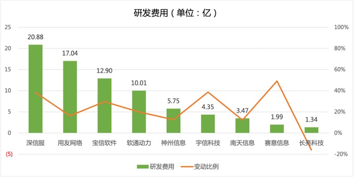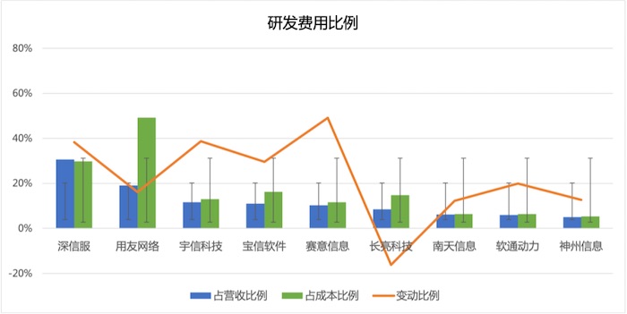 产品主导型公司在研发的投入比例上显著高于其它公司,但传统的服务商也在开始重视研发投入,体现在与上一年变动比例上,赛意信息、宇信科技增长最快,超过深信服,宝信软件也超过了用友网络,唯一增速下降的是长亮科技。