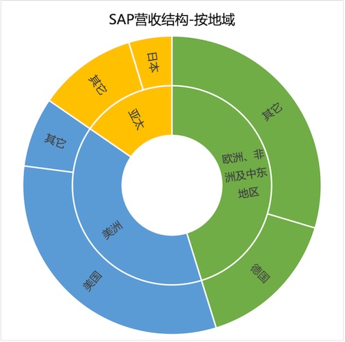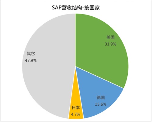 从国际厂商营收结构来看,SAP的主要营收贡献来自高购买力的欧美市场,美国占据了全球营收的31.9%,亚太地区为15.4%,不及美国的一半,排名为日本、澳大利亚、中国、印度,日本仅占4.7%,中国市场的贡献低到忽略不及。