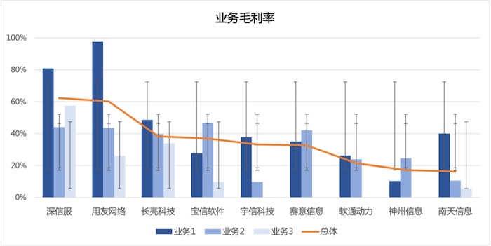 产品主导型企业有更高的毛利率。从下图看,不同业务类型的企业毛利率差异很大,产品主导型居首,行业级解决方案居次,通用服务及集成毛利率最低。