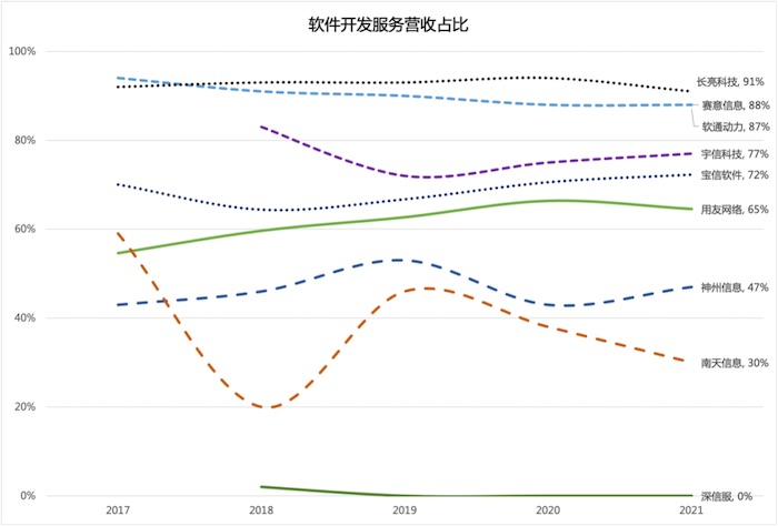 分析近五年来各家公司(部分公司上市不足五年)营收构成,除深信服之外,其它公司都有明确地列出服务类营收(包括软件开发、定制化开发、软件服务等),比重如下图所示。