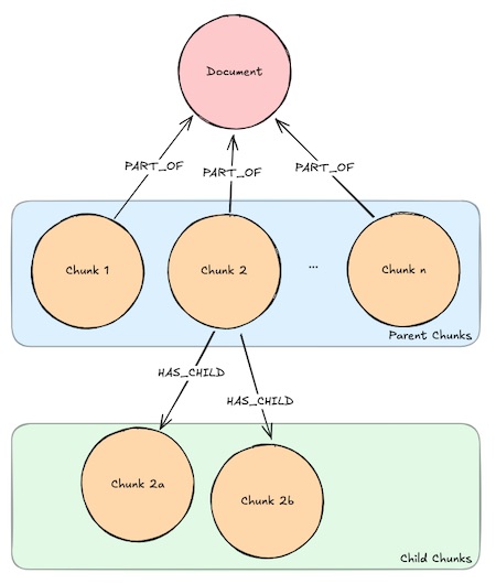 父子词汇图是词汇图的扩展,它进一步将文档分割成较大的父文本块(Parent Chunks)和较小的子文本块(Child Chunks)。子文本块用于嵌入处理和相似性搜索,而父文本块则用于在生成答案时提供更广泛的上下文信息。这种结构在父子检索器(Parent-Child Retrievers)中被广泛应用,能够更好地平衡文本块的语义信息和上下文信息,从而提高检索结果的质量和答案的准确性。