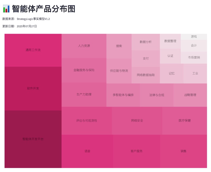智能体开发平台是AI Agent三大市场中体量最大、产品最密集的细分赛道(占21个主流产品),领先于软件开发、通用工作流。