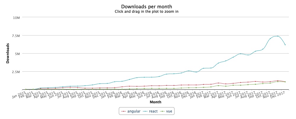 从上图(来源:npm-stat.com)看到,React在2016年Angular 2发布后逐渐拉开了增长速度,Angular增量限入了停滞,最后在2017年末被Vue追上。