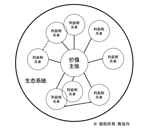 生态系统(Ecosystem)与价值链(Value Chain)的最大区别,是围绕一种价值主张的利益关系者结构,与围绕一种产品或服务提供各环节参与者的区别。