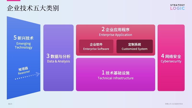 企业技术分为技术基础设施、企业应用程序、数据与分析、网络安全和新兴技术五大类别。
