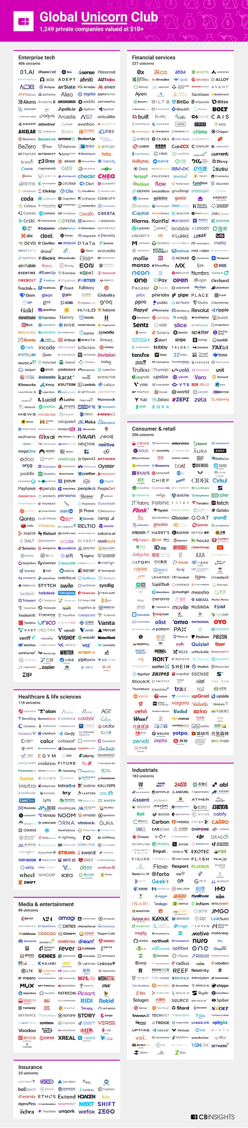 企业技术也是独角兽最多的领域,据CBInsights统计,有406家估值超过$10亿的初创企业都在企业技术,是第二位金融服务领域的近两倍。