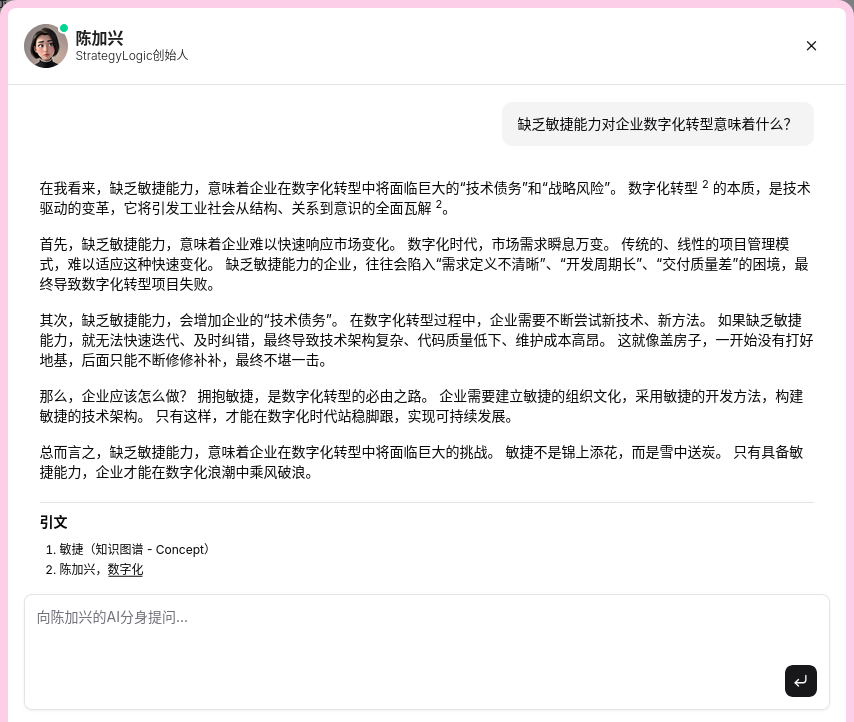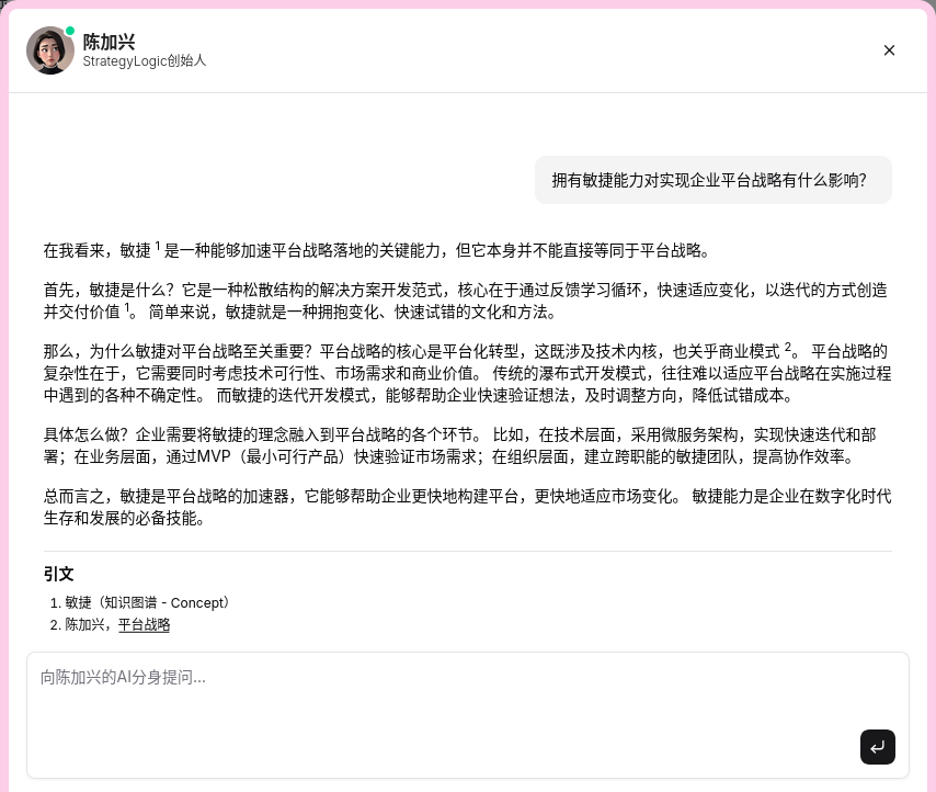 name(标题/名称): 节点的核心标识,如“平台战略”。label(标签): 节点的类型,如Concept(概念)、Blog(博客)、CaseStudy(案例研究)。这是实现差异化处理的基础。source_url(来源链接): 指向原始知识的唯一链接。对于博客,这是文章的 URL;对于内部文档,可以是文档库的链接。这是实现“可点击”溯源的关键。author(作者): 知识的创造者。publication_date(发布日期): 知识的时间戳,有助于判断信息的时效性。version(版本号): 对于会迭代的知识(如框架、方法论),版本号至关重要。context_quotes(上下文分块): 在导入长文本时,我们会将其智能分块,并将这些引文片段直接附加到节点上。这使得 AI 在查询时,能获得最相关的上下文,而非整个文档。
